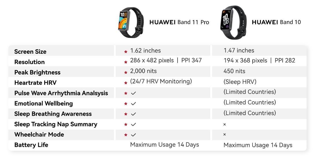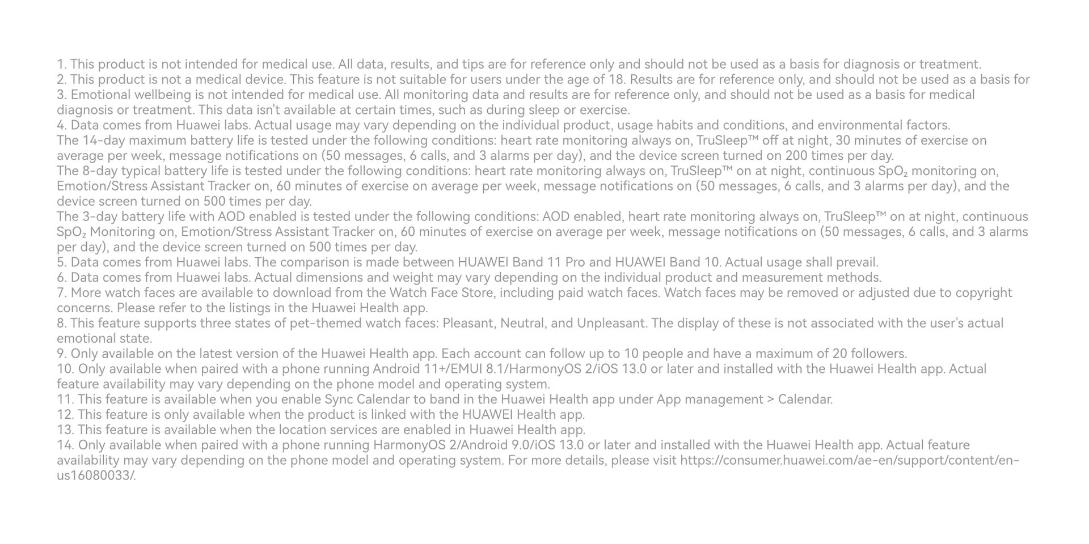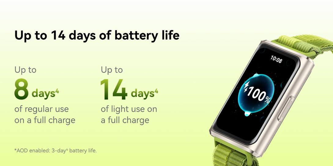 Battery Life The device can last for a maximum of 14 days. Heart rate monitoring is enabled, HUAWEI TruSleep™ is disabled. Screen is checked briefly 200 times per day, 50 messages, 6 calls and 3 alarms reminding in 24 hours, and workout for 30 minutes per week. The device can last for up to 8 days under typical usage. heart rate monitoring always on, TruSleep™ on at night, continuous SpO₂ Monitoring on, Emotion / Stress Assistant Tracker on, 60 minutes of exercise on average per week, message notifications on (50 messages, 6 calls, and 3 alarms per day), and the device screen turned on 500 times per day. The device can last for up to 3 days when AOD is on. AOD enabled, heart rate monitoring always on, TruSleep™ on at night, continuous SpO₂ Monitoring on, Emotion / Stress Assistant Tracker on, 60 minutes of exercise on average per week, message notifications on (50 messages, 6 calls, and 3 alarms per day), and the device screen turned on 500 times per day. *Data comes from HUAWEI labs. Actual usage may vary depending on the specific product, usage habits, and environmental factors.