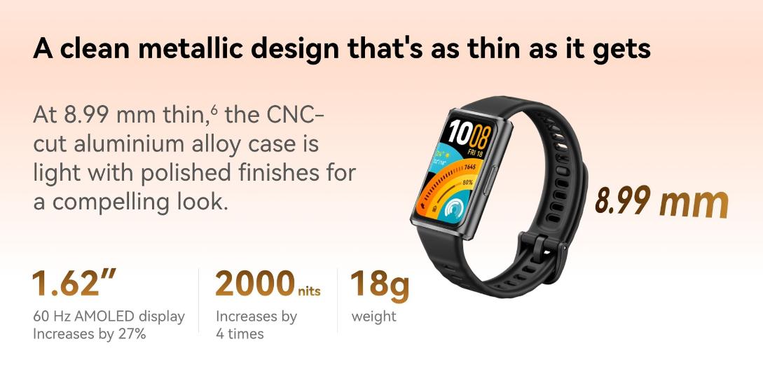 Dimensions 43.5×28.2×8.99 *8.99 mm is the thickness of the band measured at its thinnest point (the distance from the surface of the watch to the bottom cover, and does not include the sensor area). *Product size, product weight, and related specifications are theoretical values only. Actual measurements between individual products may vary. All specifications are subject to the actual product.